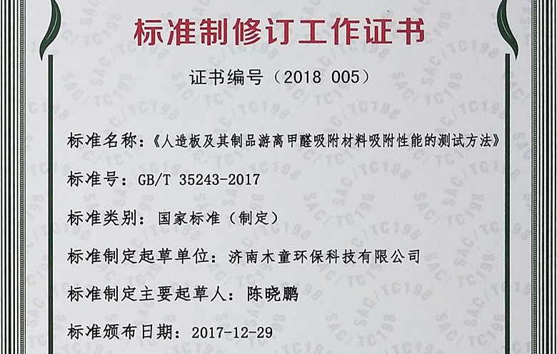 參加《人造板甲醛吸附材料》國標(biāo)制定
