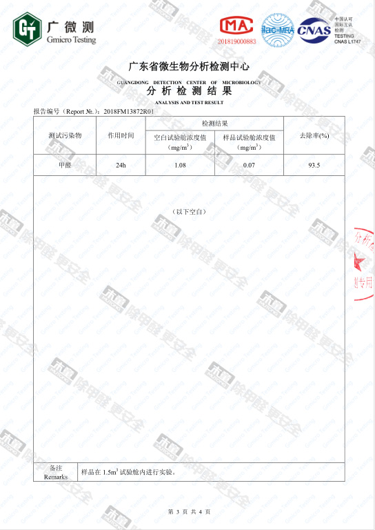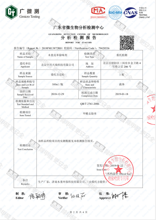 木童皮革除味劑甲醛去除率檢測(cè)報(bào)告